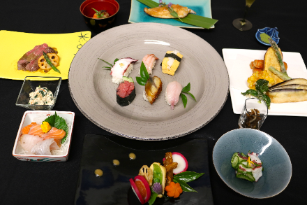 Starter- seasonal small dishes with Japanese fruit wine, Sashimi- today's fish by following the season, Steamed Dish- chef's choice, Grilled Dish- today's fish and beef steak, Fried Dish- assorted tempura with dipping dashi sauce or matcha salt, Soup/Steam dishes- Japanese Dashi with vegetables, seafood etc, Sushi(Main)- today's choice of 6 nigiri sushi.